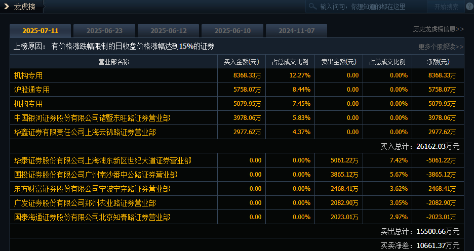 浩欧博今日20cm涨停,2家机构专用席位净买入1.34亿