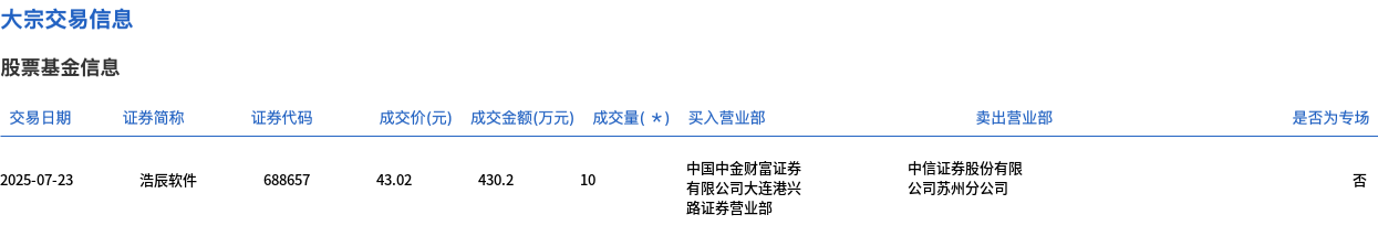 浩辰软件今日大宗交易折价成交10万股,成交额430.2万元