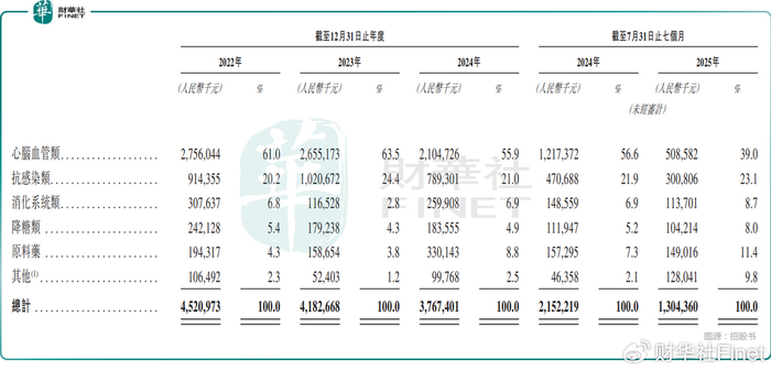 事实上,分领域来看,心脑血管类的收入近年出现大幅下降,2022年时的收入为27.56亿元,占收入比重为61.0%,2025年前7个月降至5.09亿元,占收入比重为39.0%。而悦康通就是心脑血管类中的核心产品。