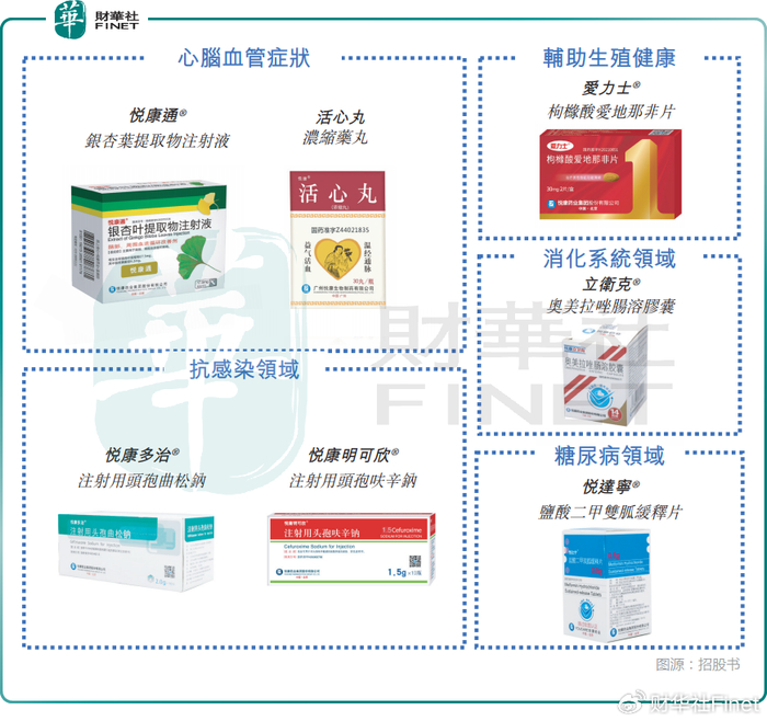 在产品方面,悦康药业已经有发展成熟的商业产品组合,包括超过80种产品。其中,核心产品悦康通(银杏叶提取物注射液)在中国的医院覆盖面广泛,包括三级及二级医院,用于管理脑血管和外周血管障碍;爱力士(枸橼酸爱地那非片)在中国的泌尿科和男科环境中用于处方,治疗男性勃起功能障碍;立卫克(奥美拉唑肠溶胶囊)和悦达宁(盐酸二甲双胍缓释片)等其他关键产品进一步扩大了公司在主要治疗领域的覆盖面。悦康药业亦销售具有广泛标示适应症的头孢菌素抗生素。