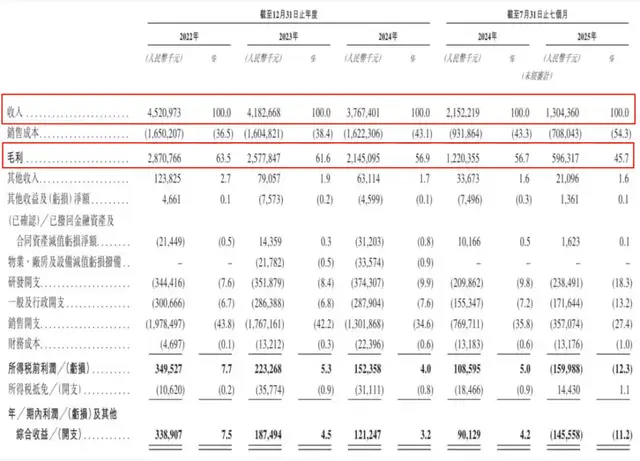 利润端,净利润从 2022 年的 3.39 亿元跌至 2024 年的 1.21 亿元,2025 年前 7 个月净亏损 1.46 亿元;毛利率也从 63.5% 逐年下滑至 45.7%,盈利能力持续弱化。