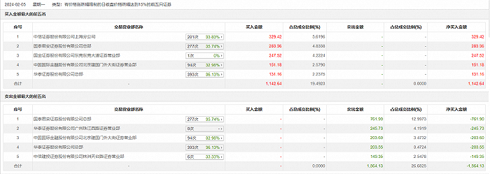 2月5日,元琛科技今日跌停,全天换手率达10.46%,振幅达19.92%。龙虎榜数据显示,营业部席位合计净卖出421.48万元。其中,国泰君安证券总部、华泰证券广州珠江西路证券营业部分别卖出761.90万元、245.73万元;中信证券上海分公司、国泰君安证券总部分别买入329.42万元、283.36万元。