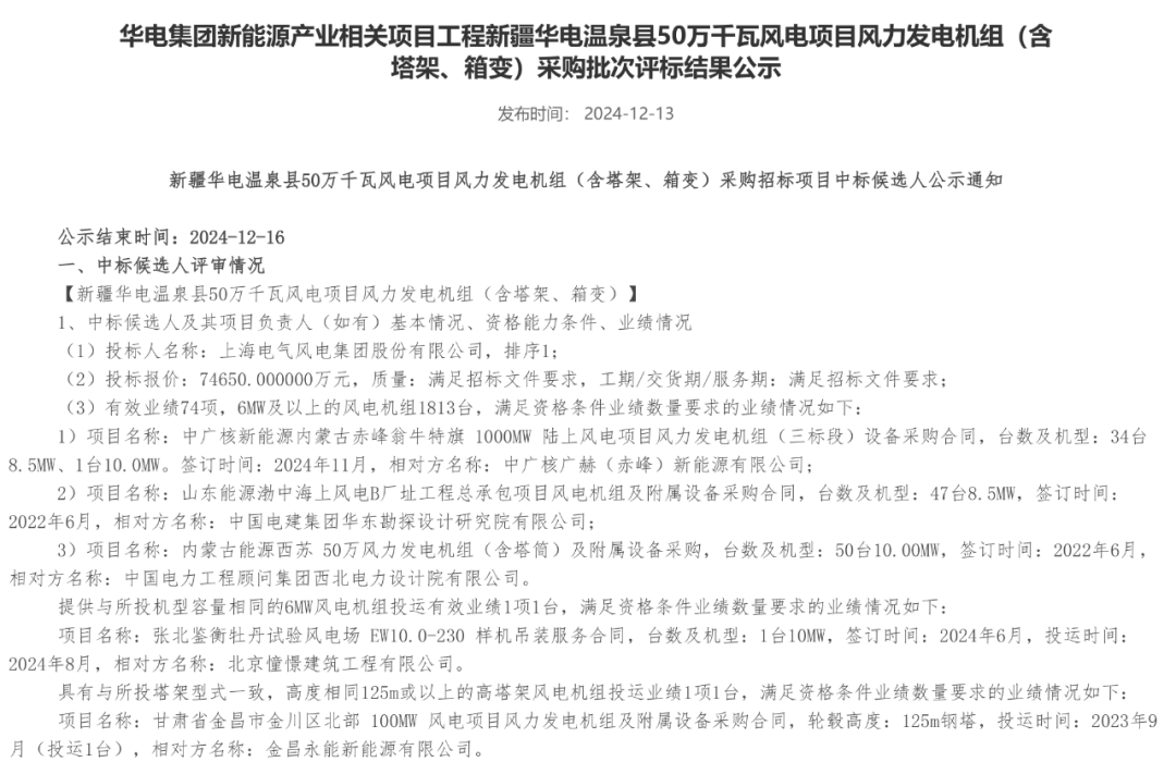 中国风电新闻网讯:近日,华电集团新能源产业相关项目工程新疆华电温泉县50万千瓦风电项目风力发电机组(含塔架、箱变)采购批次评标结果公示,