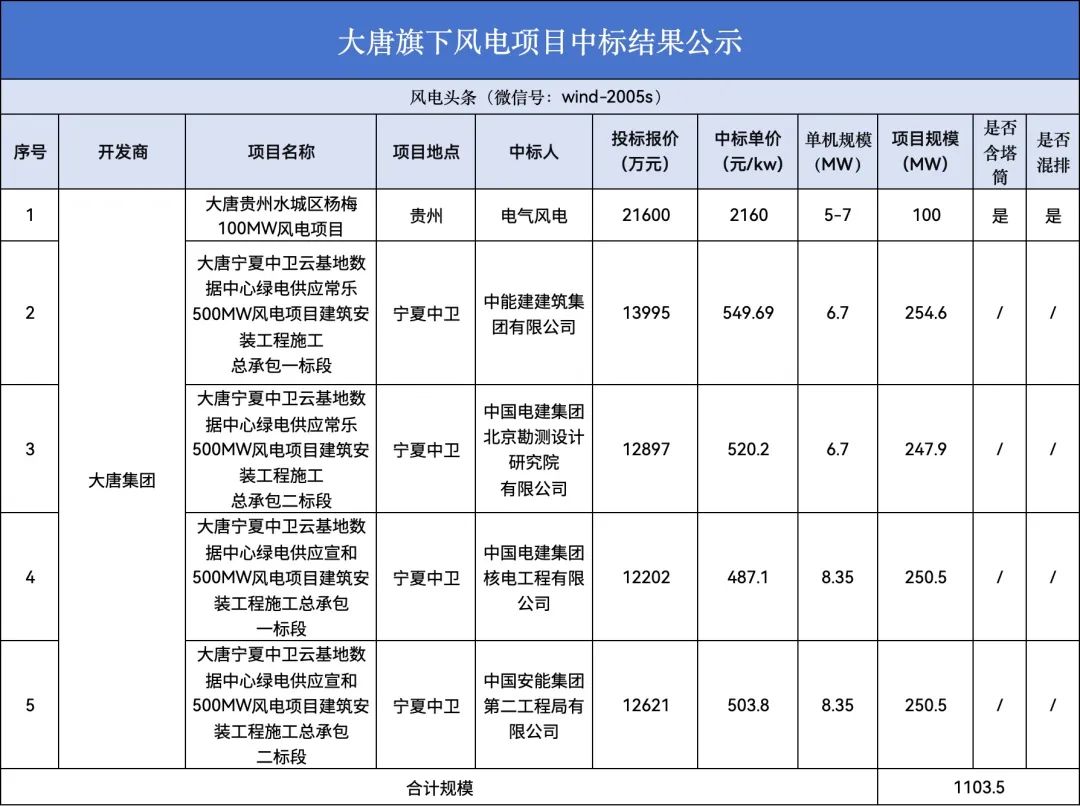 电气风电、中电建等公司中标!规模超1100GW!大唐5个风电项目中标结果出炉!