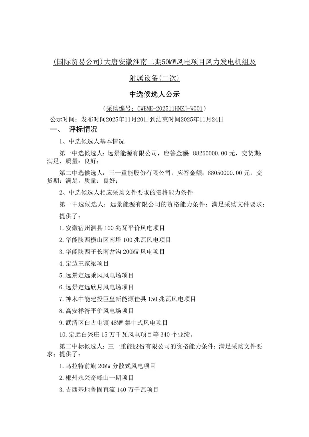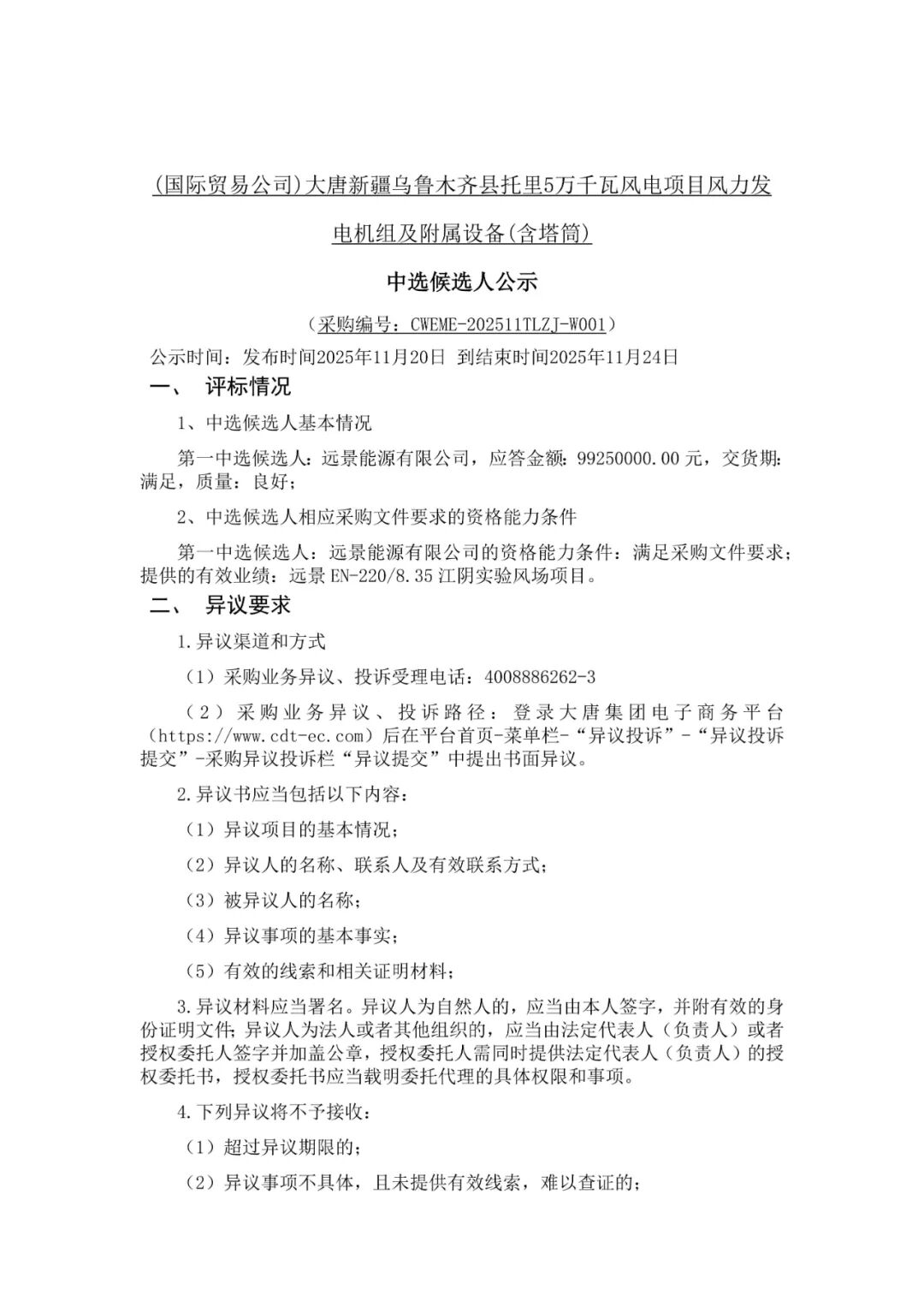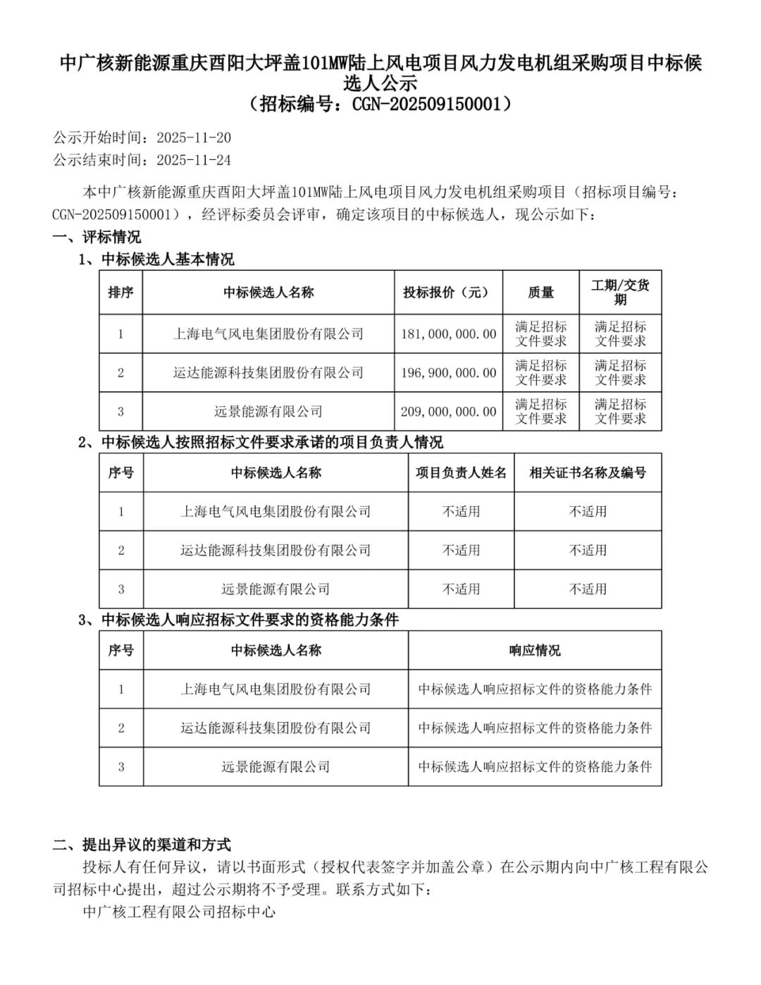 远景能源、电气风电预中标!大唐、中广核201MW风机采购中标候选公示