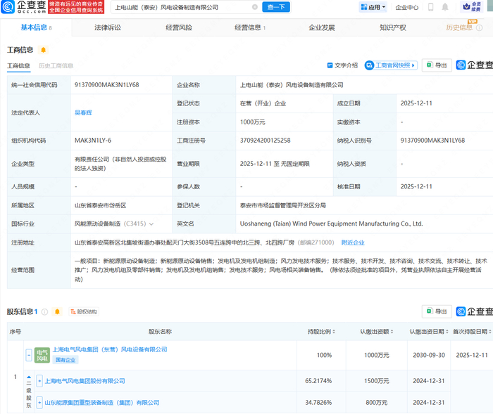 企查查APP显示,近日,上电山能(泰安)风电设备制造有限公司成立,法定代表人为吴春辉,注册资本为1000万元,经营范围包含:新能源原动设备制造;新能源原动设备销售;发电机及发电机组制造;风力发电技术服务等。企查查股权穿透显示,该公司由电气风电(688660)旗下上海电气风电集团(东营)风电设备有限公司全资持股。