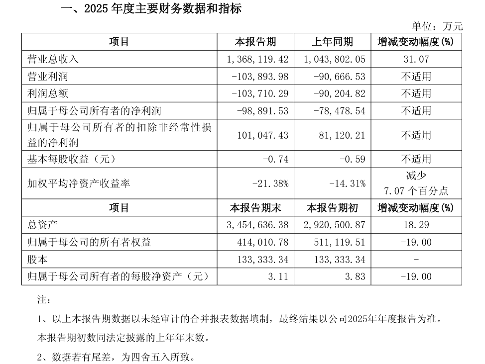 公告披露,经公司初步核算,2025年度公司实现营业总收入136.81亿元,较上年同期增加31.07%;实现归属于母公司所有者的净利润为-9.89亿元,较上年同期增加亏损2.04亿元;实现归属于母公司所有者的扣除非经常性损益的净利为-10.10亿元,较上年同期增加亏损1.99亿元。
