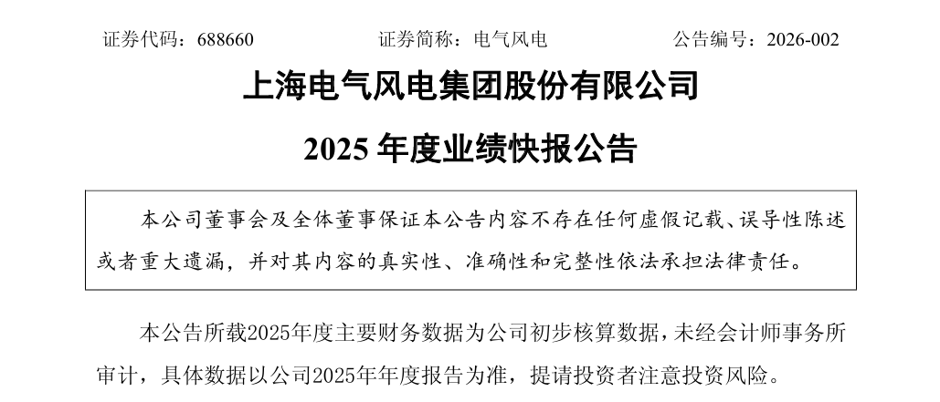 2月28日,上海电气风电集团股份有限公司(以下简称“电气风电”或“公司”)发布《2025年度业绩快报公告》。