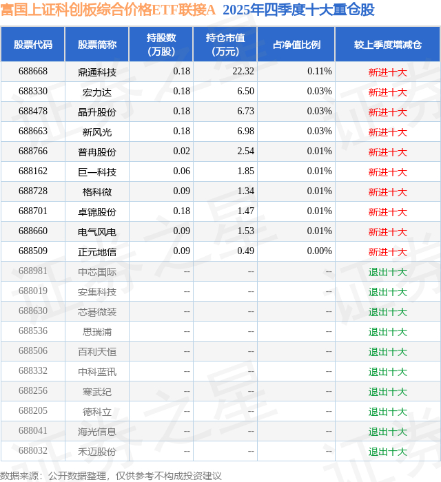 富国上证科创板综合价格ETF联接A的前十大重仓股如下: