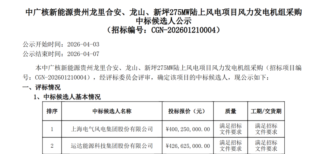 风芒能源获悉,4月3日,中广核新能源贵州龙里合安、龙山、新坪275MW陆上风电项目风机采购中标候选人公示。