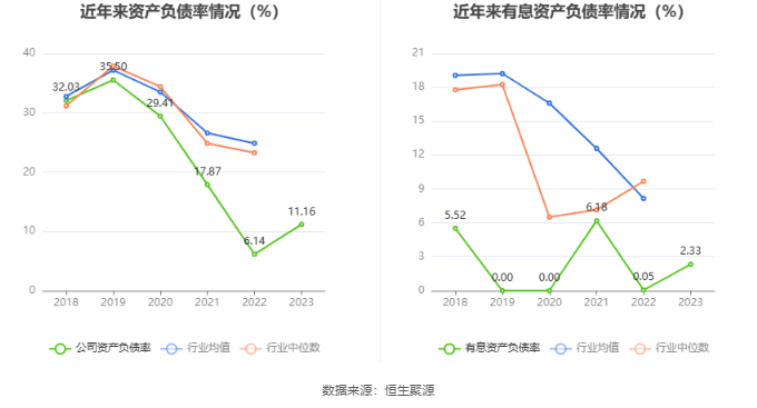 在偿债能力方面,公司2023年年末资产负债率为11.16%,相比上年末上升5.02个百分点;有息资产负债率为2.33%,相比上年末上升2.28个百分点。