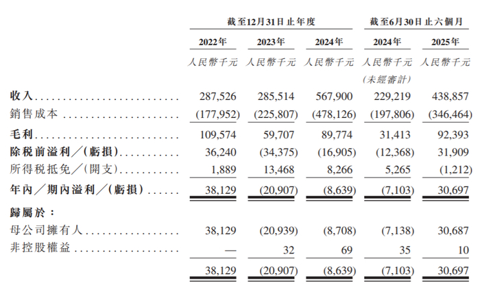 业绩方面,2022年、2023年、2024年及2025年截至6月30日止六个月,和林微纳实现收入分别约为2.88亿元、2.86亿元、5.68亿元及4.39亿元;同期,年内/期内溢利为3812.9万元、-2090.7万元、-863.9万元及3069.7万元。