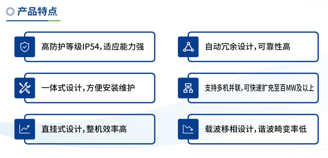 该解决方案具有单台大容量、单簇控制、无升压变压器、高效率、高质量输出波形、自动旁路等优势,实现了系统运行效率的显著提升和安全性能的全面增强,能够更好地满足新型电力系统对高安全性和经济性的要求。其技术特点包括:高防护等级IP54,适应能力强;一体式设计,方便安装维护;直挂式设计,整机效率高;自动冗余设计,可靠性高;支持多机并联,可快速扩充至百MW及以上;载波移相设计,谐波畸变率低。该解决方案为煤矿应急电源、光伏配储、独立储能等应用场景提供了更优质的技术选择。