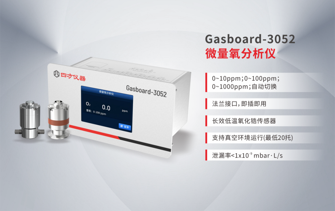 四方光电自主研发的 Gasboard-3050系列低浓度氧气分析仪,最低分辨率达0.1 ppm,量程覆盖0–10 ppm至100% O,搭载经现场长期验证的氧化锆传感器,具备优异的再现性与高速响应特性,能对工艺气体及设备腔室中的氧含量进行精准监测,从而有效帮助客户从源头控制氧污染,为提升产品良率提供可靠保障。