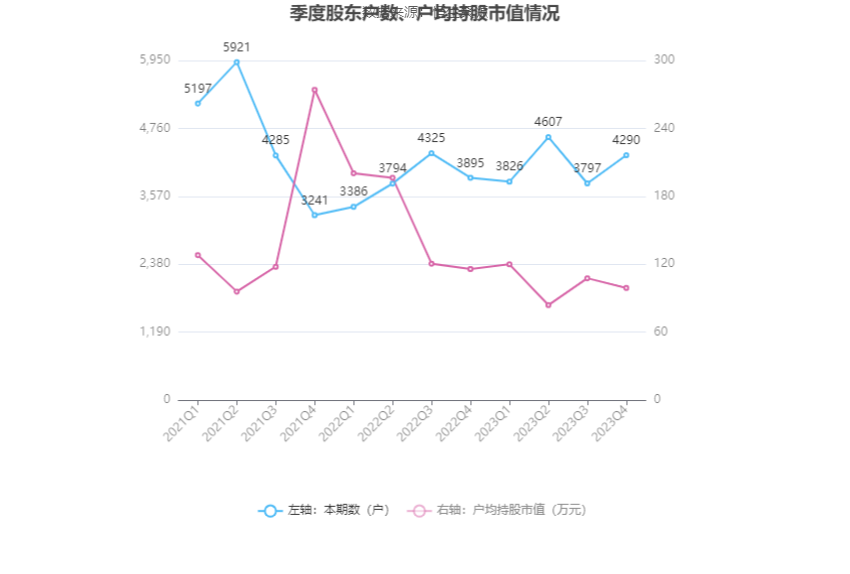 筹码集中度方面,截至2023年年末,公司股东总户数为4290户,较三季度末增长了493户,增幅12.98%;户均持股市值由三季度末的107.66万元下降至99.08万元,降幅为7.97%。