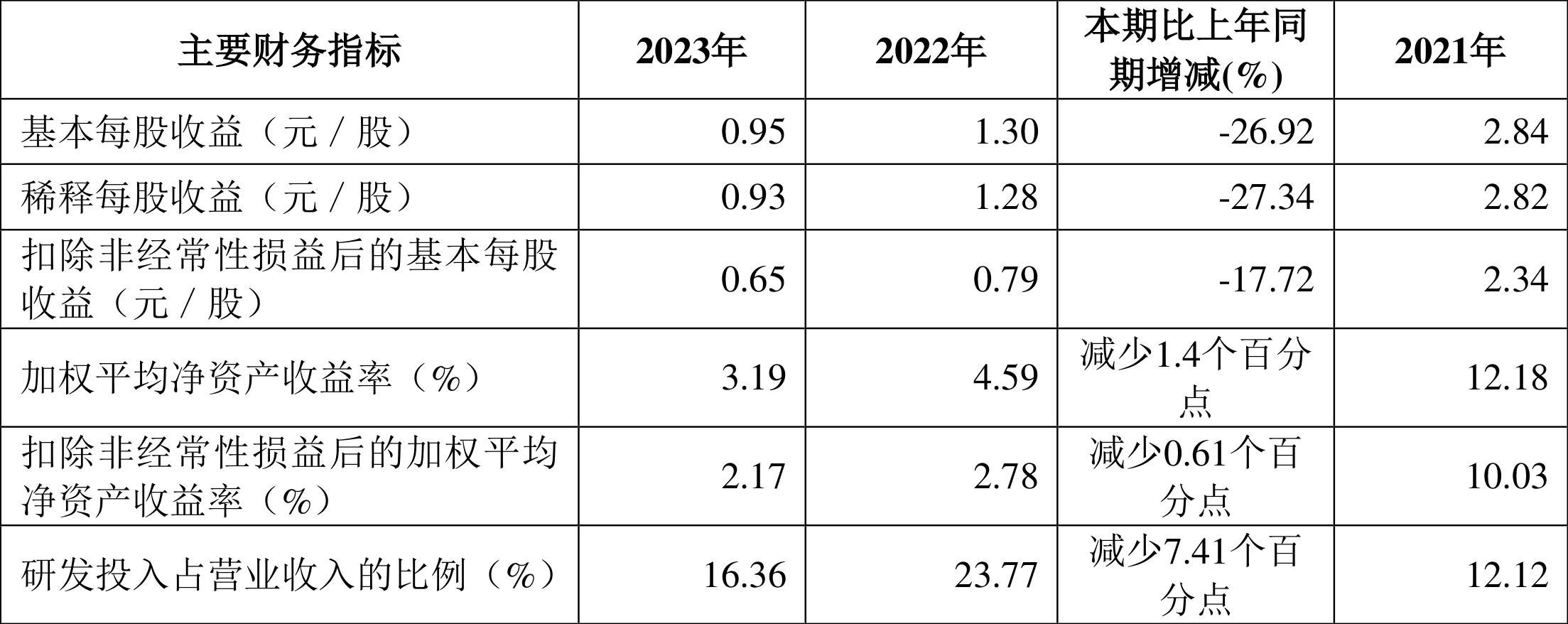 2023年全年,公司研发投入金额为1.65亿元,同比下降2.52%;研发投入占营业收入比例为16.36%,相比上年同期下降7.41个百分点。