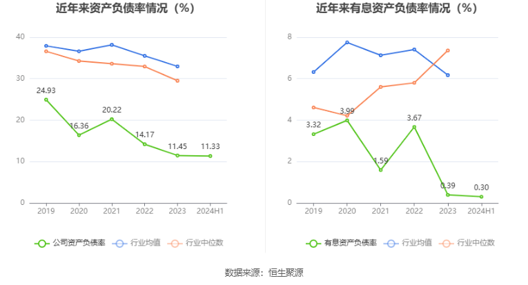在偿债能力方面,公司2024年上半年末资产负债率为11.33%,相比上年末下降0.12个百分点;有息资产负债率为0.30%,相比上年末下降0.09个百分点。