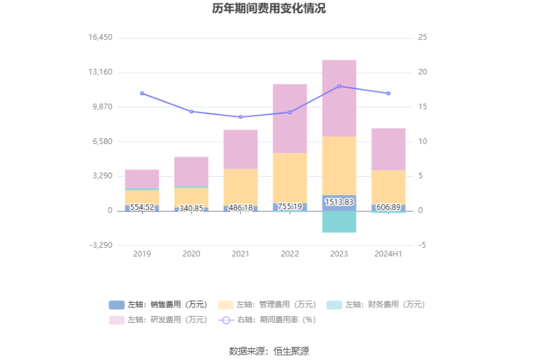 2024年上半年,公司期间费用为7680.39万元,较上年同期增加2077.38万元;期间费用率为16.99%,较上年同期上升0.12个百分点。其中,销售费用同比增长50.28%,管理费用同比增长14.31%,研发费用同比增长14.84%,财务费用由去年同期的-1131.13万元变为-181.04万元。