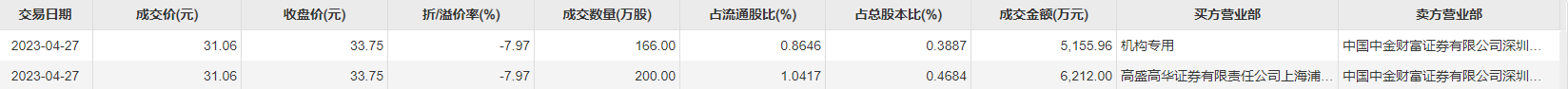 4月27日大宗交易成交366万股,成交额1.14亿元,占当日总成交额的27.03%,成交价31.06元,较市场收盘价33.75元折价7.97%。