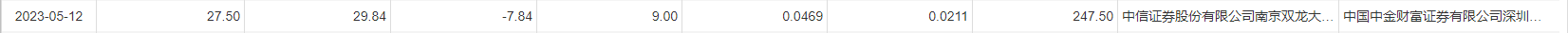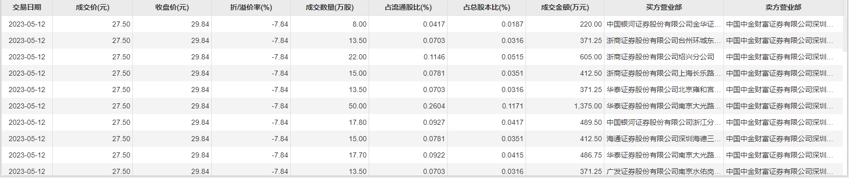 5月12日大宗交易成交195万股,成交额5362.5万元,占当日总成交额的38.95%,成交价27.5元,较市场收盘价29.84元折价7.84%。