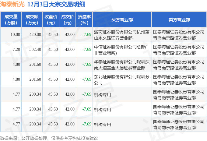 12月3日海泰新光现7笔大宗交易 机构净买入601.02万元
