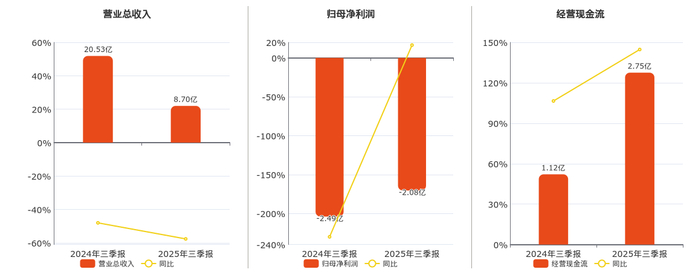 公司营业总收入为8.70亿元,在已披露的同业公司中排名第56,较去年同报告期营业总收入减少11.83亿元,同比较去年同期下降57.62%。归母净利润为-2.08亿元,在已披露的同业公司中排名第48。经营活动现金净流入为2.75亿元。