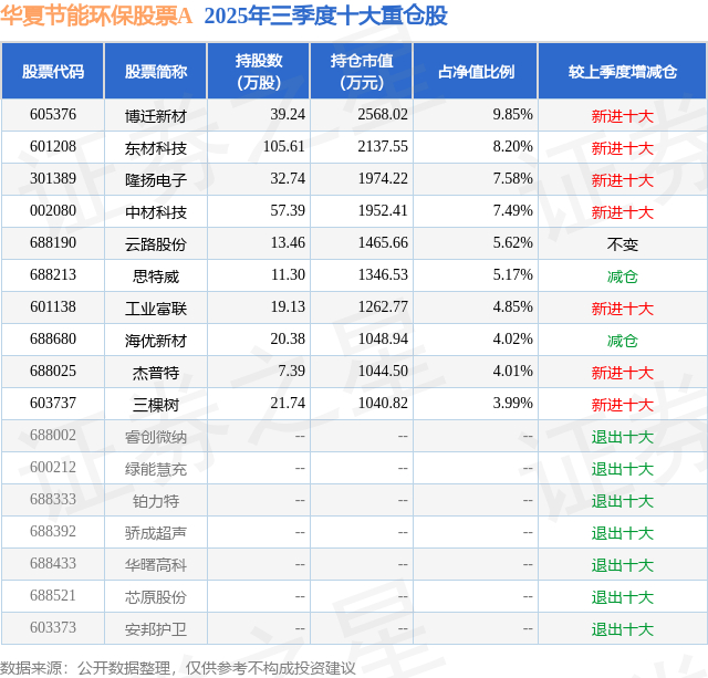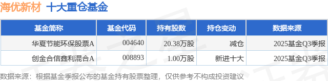 根据2025基金Q3季报公募基金重仓股数据,重仓该股的公募基金共2家,其中持有数量最多的公募基金为华夏基金的华夏节能环保股票A。华夏节能环保股票A目前规模为2.54亿元,最新净值1.9024(11月19日),较上一交易日下跌0.79%,近一年上涨7.32%。该公募基金现任基金经理为吕佳玮。吕佳玮在任的基金产品包括:华夏核心成长混合A,管理时间为2021年12月3日至今,期间收益率为-28.15%;华夏低碳经济一年持有混合A,管理时间为2022年6月28日至今,期间收益率为-18.2%;华夏成长机会一年持有混合,管理时间为2023年4月6日至今,期间收益率为-10.54%。