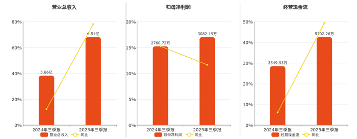 公司营业总收入为6.51亿元。归母净利润为3082.19万元。经营活动现金净流入为5302.26万元。