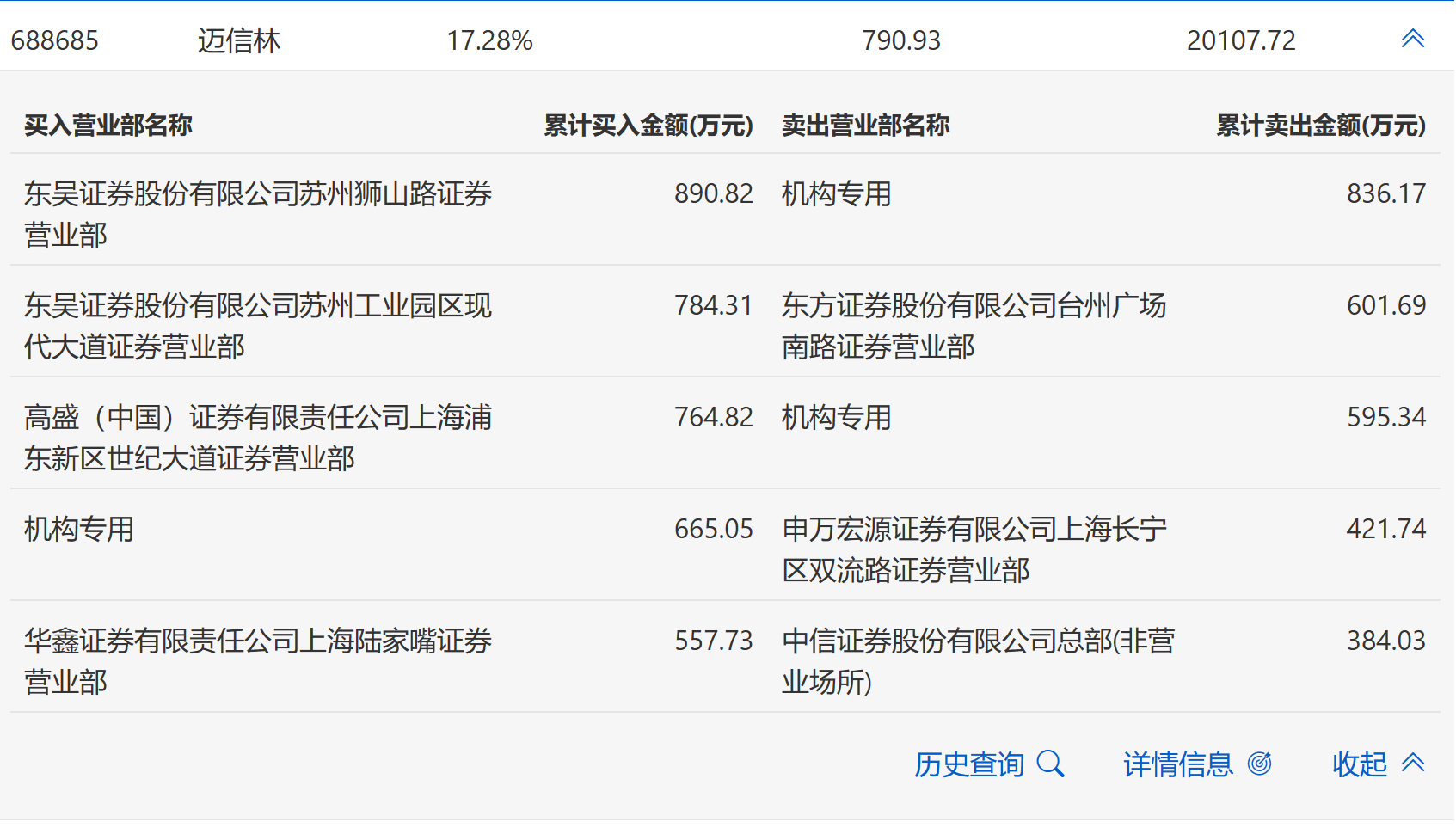 12月21日,迈信林今日涨17.28%,全天换手率达13.97%,振幅达20.44%。龙虎榜数据显示,营业部席位合计净买入823.76万元。其中,机构买入665.05万元,卖出1431.51万元,合计净卖出766.47万元。此外,东吴证券苏州狮山路证券营业部、东吴证券苏州工业园区现代大道证券营业部分别买入890.82万元、784.31万元;东方证券台州广场南路证券营业部、申万宏源证券有限公司上海长宁区双流路证券营业部分别卖出601.69万元、421.74万元。