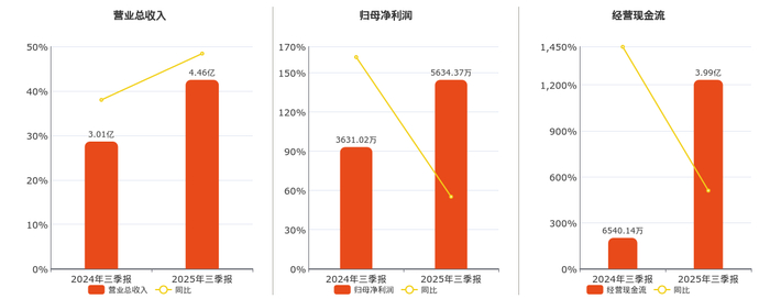 公司营业总收入为4.46亿元,在已披露的同业公司中排名第38。归母净利润为5634.37万元,在已披露的同业公司中排名第26。经营活动现金净流入为3.99亿元。