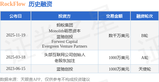 【投融资动态】RockFlowB轮融资,融资额数千万美元,投资方为蚂蚁集团、Monolith砺思资本等
