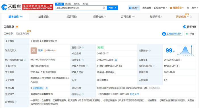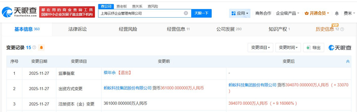 雷达财经讯,天眼查工商信息显示,近日,上海云抒企业管理有限公司发生工商变更,注册资本由36.1亿人民币增至约39.4亿人民币,增幅约9%。