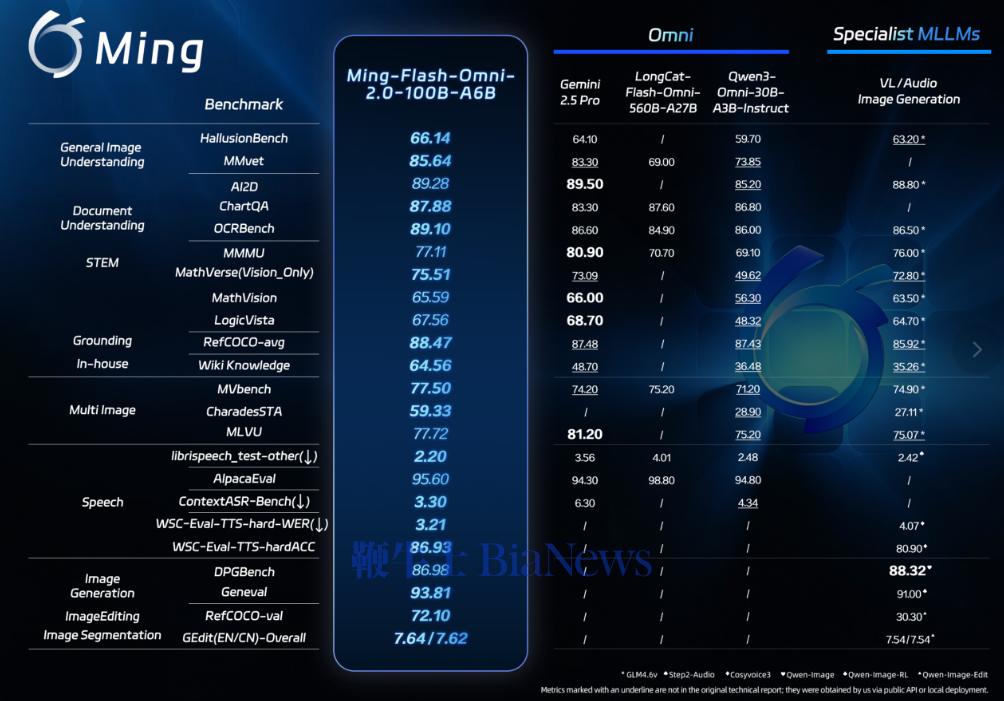 2 月 11 日,蚂蚁集团正式开源发布全模态大模型 Ming-Flash-Omni 2.0。作为 Ming-Omni 系列的最新版本,该模型在视觉语言理解、语音可控生成、图像生成与编辑等核心能力上实现系统性升级,在多项公开基准测试中达到开源领先水平,部分指标超过 Gemini 2.5 Pro。