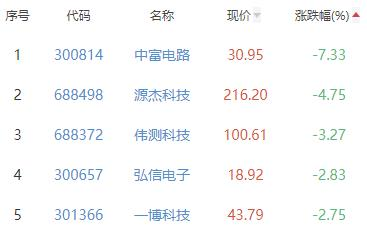 中富电路、源杰科技、伟测科技、弘信电子、一博科技位列涨幅榜后五位,涨幅分别为-7.33%、-4.75%、-3.27%、-2.83%、-2.75%。