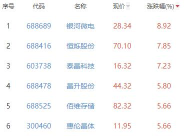 其中,银河微电、恒烁股份、泰晶科技、晶升股份、佰维存储、惠伦晶体位列板块涨幅前五位,涨幅分别为8.92%、7.85%、7.23%、5.80%、5.66%、5.66%。