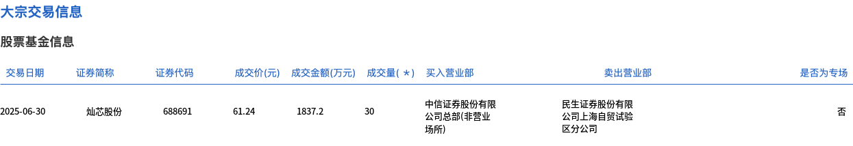 灿芯股份今日大宗交易折价成交30万股,成交额1837.2万元
