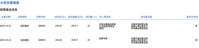10月21日,灿芯股份大宗交易成交30万股,成交额4145.4万元,占当日总成交额的2.53%,成交价138.18元,较市场收盘价141元折价2%。