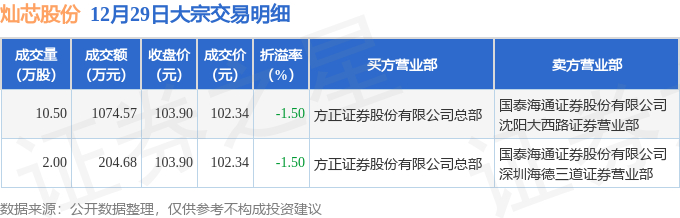 12月29日灿芯股份现1279.25万元大宗交易