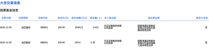 12月30日,灿芯股份大宗交易成交17.29万股,成交额1849.41万元,占当日总成交额的1.62%,成交价106.94元,较市场收盘价108.57元折价1.5%。