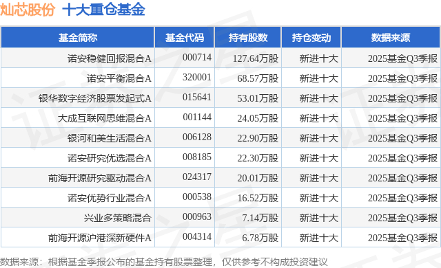 根据2025基金Q3季报公募基金重仓股数据,重仓该股的公募基金共20家,其中持有数量最多的公募基金为诺安基金的诺安稳健回报混合A。诺安稳健回报混合A目前规模为3.59亿元,最新净值2.119(1月7日),较上一交易日下跌0.09%,近一年上涨99.34%。该公募基金现任基金经理为邓心怡。邓心怡在任的基金产品包括:诺安平衡混合A,管理时间为2022年10月15日至今,期间收益率为45.38%;诺安优势行业混合A,管理时间为2025年3月6日至今,期间收益率为25.55%;诺安研究优选混合A,管理时间为2025年3月6日至今,期间收益率为72.32%。