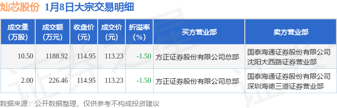 1月8日灿芯股份发生2笔大宗交易 成交金额1415.38万元