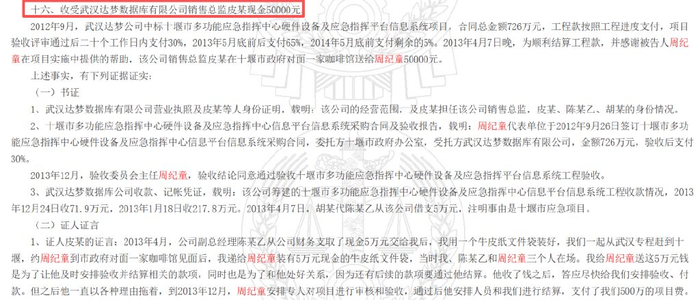 2013年4月7日,为了顺利结算工程款并感谢周纪童在项目实施过程中提供的帮助,达梦数据销售总监皮某送给周纪童5万元。