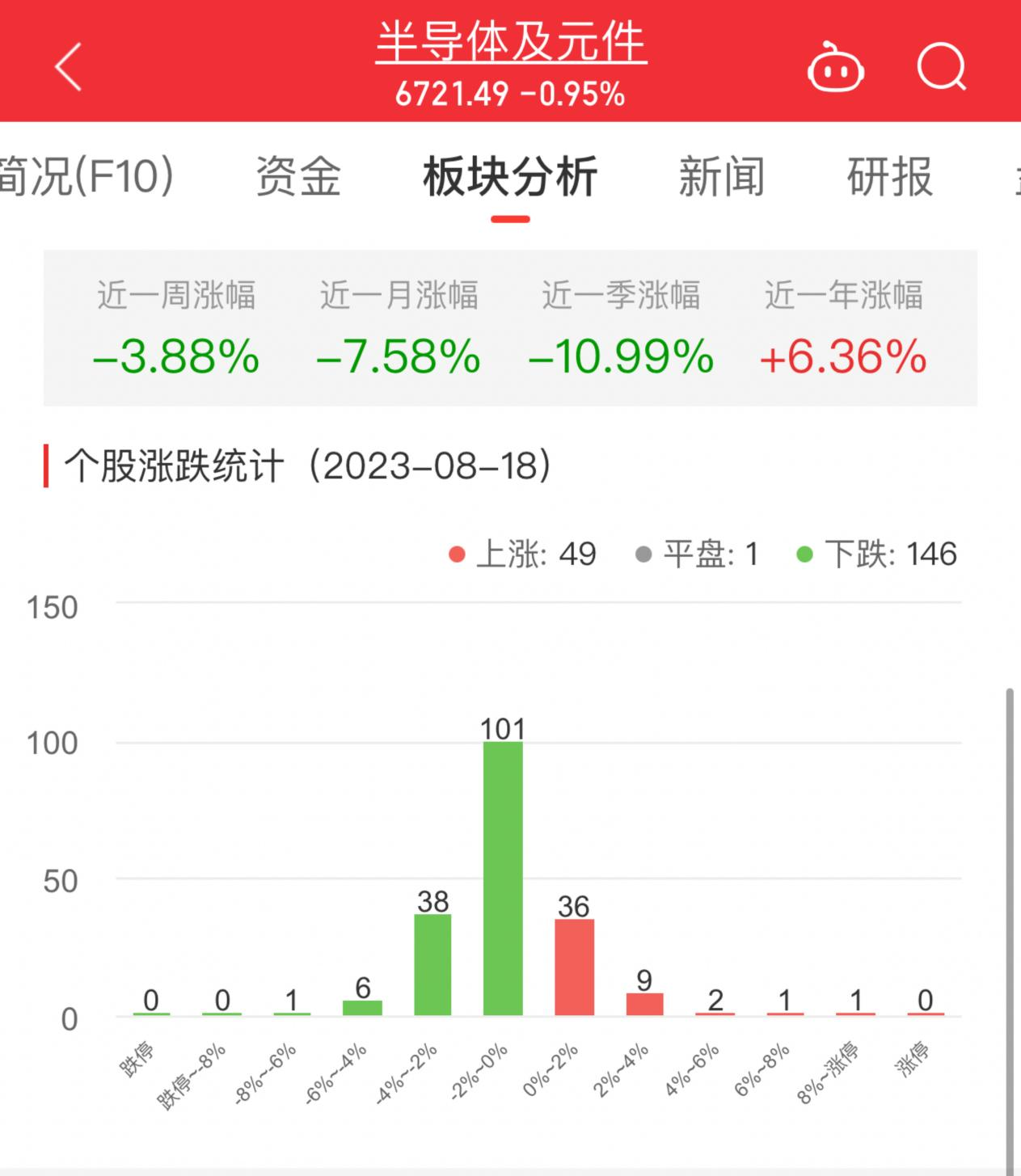 中国经济网北京8月18日讯 今日,半导体及元件板块整体跌幅0.95%,其中49只股票上涨,1只股票平盘,146只股票下跌。