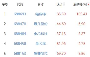 其中,锴威特、晶升股份、南芯科技、美芯晟、唯捷创芯位列板块涨幅前五位,涨幅分别为109.41%、6.90%、5.27%、4.78%、3.86%。