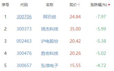 阿石创、扬杰科技、沪电股份、胜宏科技、弘信电子位列涨幅榜后五位,涨幅分别为-7.97%、-5.99%、-5.38%、-5.02%、-4.72%。