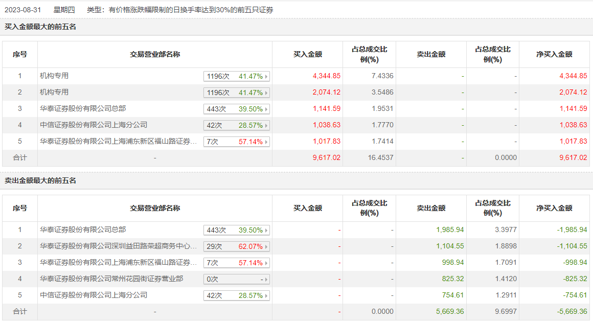 8月31日涨8.69%,成交额5.84亿元,换手率53.43%,盘后龙虎榜数据显示,二机构净买入6418.97万元。