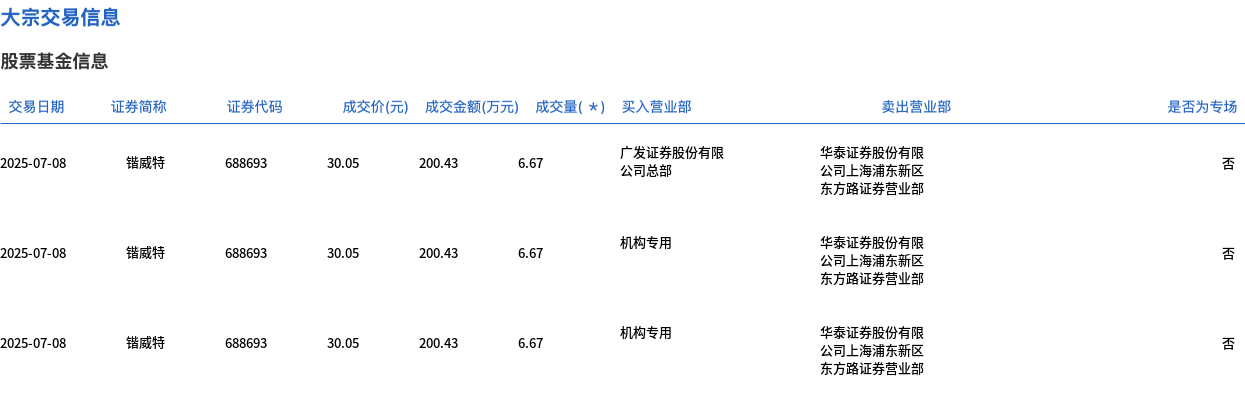 锴威特今日大宗交易折价成交20.01万股,成交额601.29万元