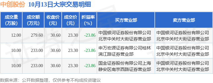 10月13日中创股份现3笔折价23.86%的大宗交易 合计成交745.6万元