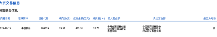 10月15日,中创股份大宗交易成交20.76万股,成交额489.31万元,占当日总成交额的4.8%,成交价23.57元,较市场收盘价30.95元折价23.84%。