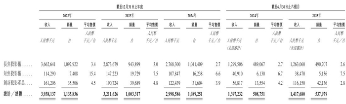 但就极米科技现阶段的收入构成来看,消费级智能投影仍是其核心创收来源。2022年、2023年、2024年度和2025年上半年(即“报告期”),该公司的长焦投影仪收入在其销售投影整机业务中的占比分别达到86.8%、80.9%、81.4%和77.8%。